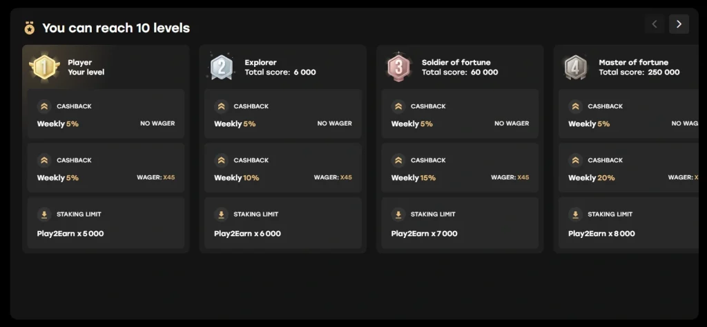 El programa de Fairspin VIP está estructurado en 10 niveles, cada uno ofreciendo beneficios más sustanciales que el anterior. A medida que subes de nivel, tu estatus se eleva y las recompensas se vuelven más exclusivas. El nivel más alto, el «Master of Fortune», ofrece el máximo de beneficios, pero cada nivel intermedio te acerca a tu potencial de ganancias. El camino hacia la cima está diseñado para ser claro y alcanzable, recompensando tu compromiso de manera constante.